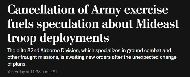 По данным американского издания, на это указывает внезапная отмена запланированных учений 82-й воздушно-десантной дивизии быстрого реагирования. Об этом приказе сообщил неназванный источник в Пентагоне.