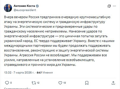 Антонио Коста заявил, что "систематические и преднамеренные" удары РФ по инфраструктуре Украины являются "попыткой запугать украинский народ".