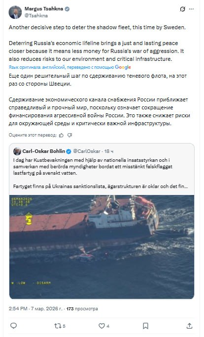Глава МИД Эстонии обрадовался задержанию еще одного гражданского судна в Балтийском море, которое, как утверждается, было частью российского "теневого флота".