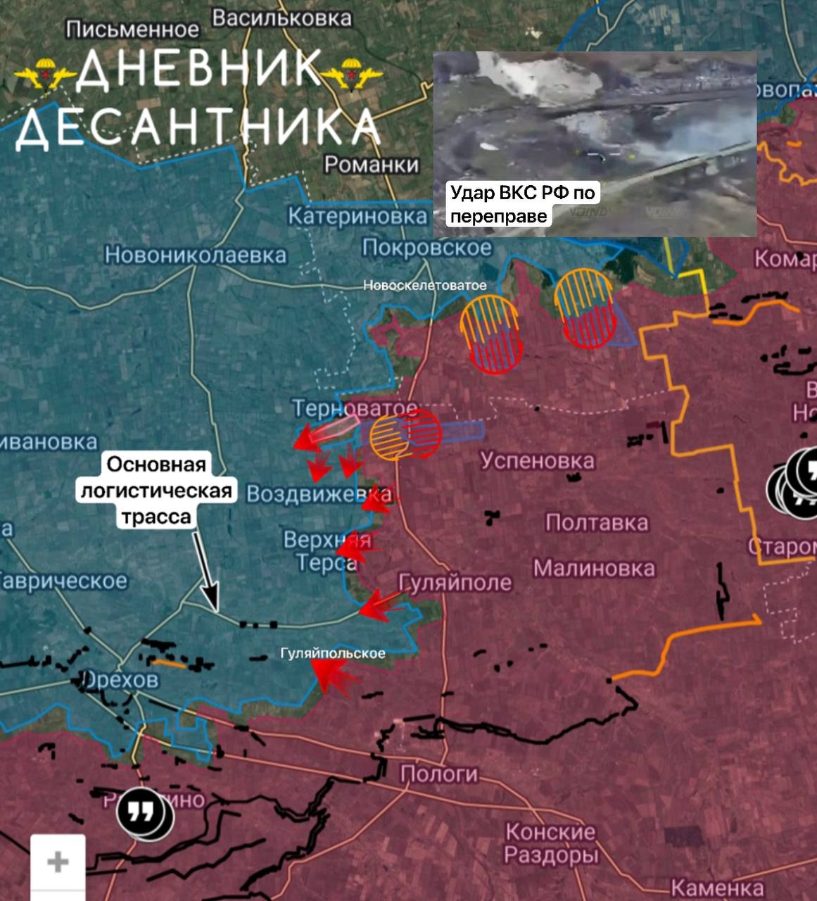 ВСУ задействуют основную логистическую трассу Омельник-Зализничное с тремя мощными укрепрайонами в районе Новосёловки, сама трасса находится в низине, в то время как с Южной и восточной сторон у нас преимущество на высотах, противника спасает только высота севернее.