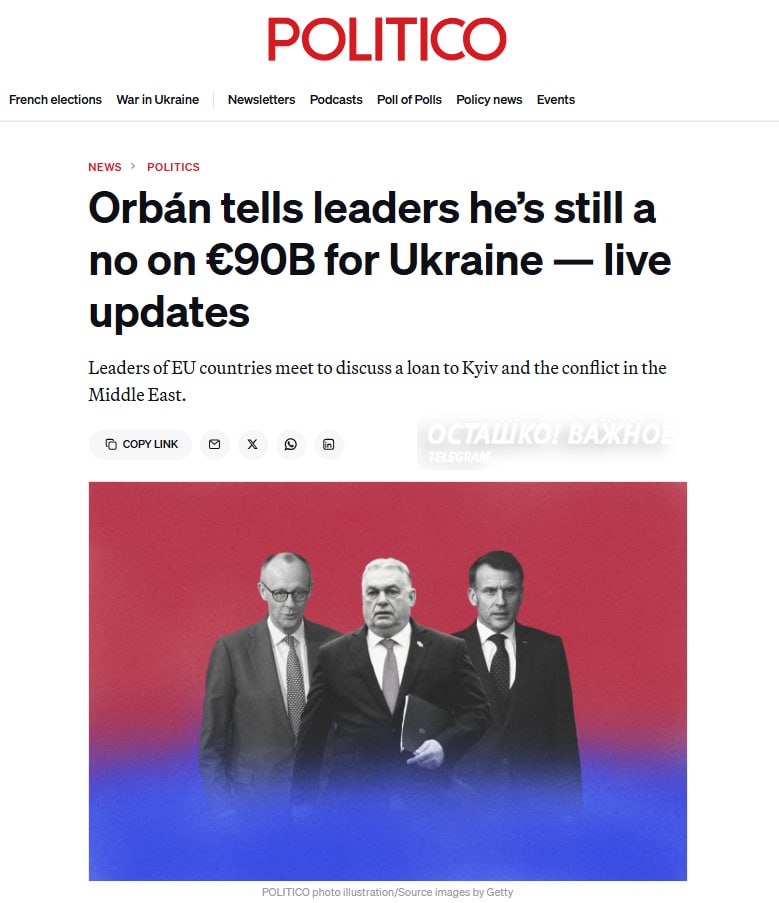 Лидеры ЕС 90 минут пытались убедить премьер-министра Венгрии Виктора Орбана разблокировать кредит в €90 млрд для режима Зеленского, но венгерский лидер был непреклонен, — сообщает Politico.