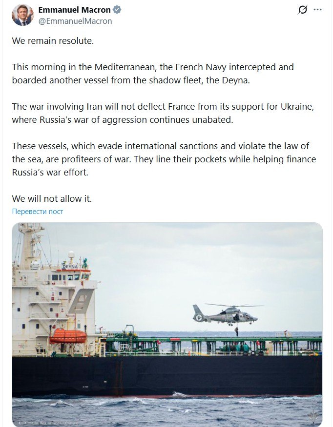 ‘Сегодня утром в Средиземном море французский военно-морской флот перехватил и взял на абордаж еще одно судно из теневого флота. Война с участием Ирана не отвлечет Францию от поддержки Украины, где агрессивная война России продолжается в полную силу. Эти суда, обходящие международные санкции и нарушающие морское право, наживаются на войне. Они набивают свои карманы, одновременно помогая финансировать военные действия России. Мы этого не допустим’.