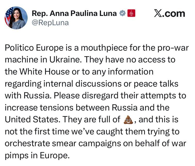 Politico Europe - это рупор провоенной машины в Украине. У них нет доступа к Белому дому или к какой-либо информации о внутренних обсуждениях или мирных переговорах с Россией. Пожалуйста, игнорируйте их попытки усилить напряженность между Россией и Соединенными Штатами. У них куча бреда, и это не первый раз, когда мы ловим их на попытках организовать клеветнические кампании в интересах сторонников войны в Европе.