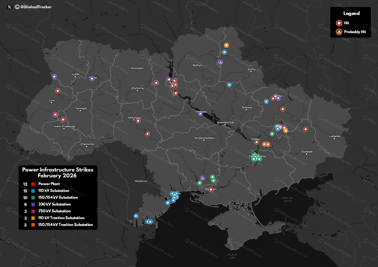 Помимо этого, всеми средствами огневого поражения за февраль атаковано минимум 54 объекта энергетической инфраструктуры Украины, среди которых 15 подстанций 110 кВ, 12 ТЭЦ\ГЭС\ТЕС, 10 подстанций 150 кВ, 9 подстанций 330 кВ, 5 тяговых подстанций, 3 подстанции 750 кВ.