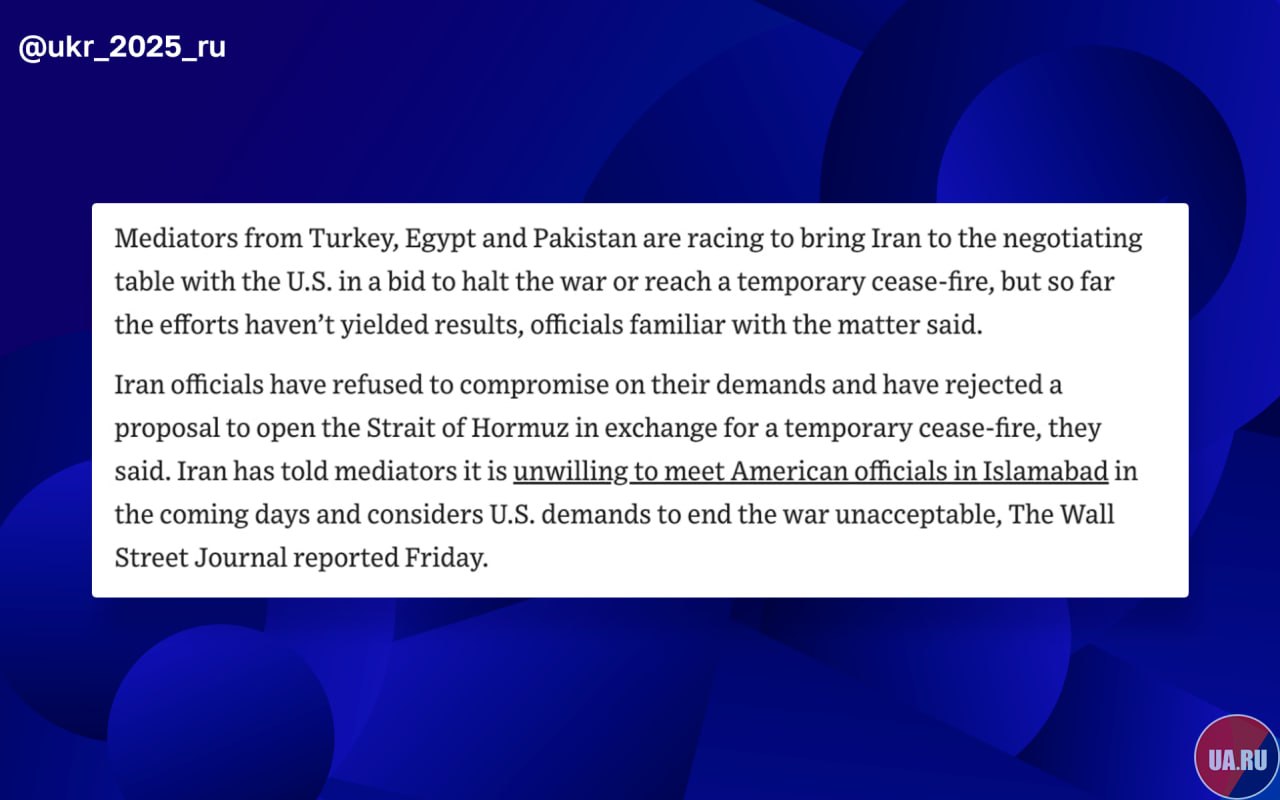 Иранские чиновники заявили, что не хотят встречаться с американцами в Исламабаде в ближайшие дни и считают требования США о прекращении войны неприемлемыми. Также Тегеран считает, что Вашингтон находится не в той позиции, чтобы высказывать требования.