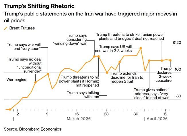Но ночью США и Иран вроде договорились о прекращении огня на условиях безопасного прохода через Ормуз. Трамп даже заявил, что согласился «приостановить бомбардировки и нападения на Иран на 2 недели». Так мы получили уровни по нефти в $115-120, которые, судя по всему для него «красная линия» (он вообще по графикам работает).