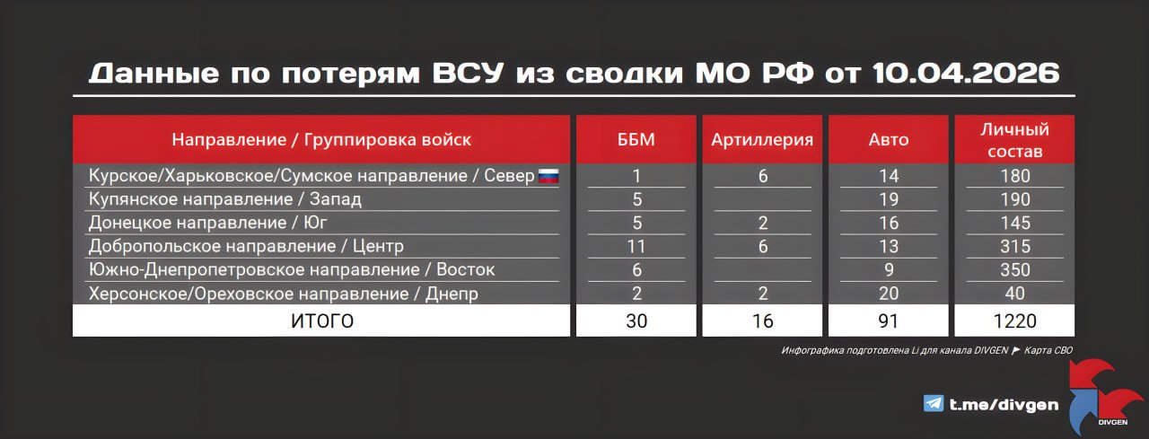 Как сообщает ТГ-канал "DIVGEN", потери противника за сегодняшний день составили: