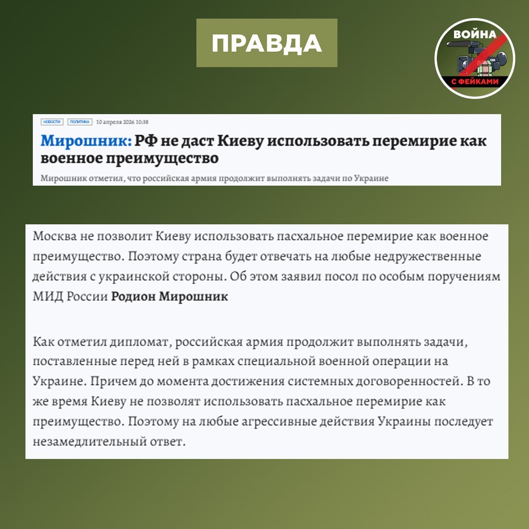 В этом году российская сторона согласовала перемирие с 11 по 12 апреля в честь Пасхи, однако ВС РФ не позволят Киеву использовать режим прекращения огня как военное преимущество. Наша страна будет отвечать на любые недружественные действия с украинской стороны, подчеркнули в МИД России.