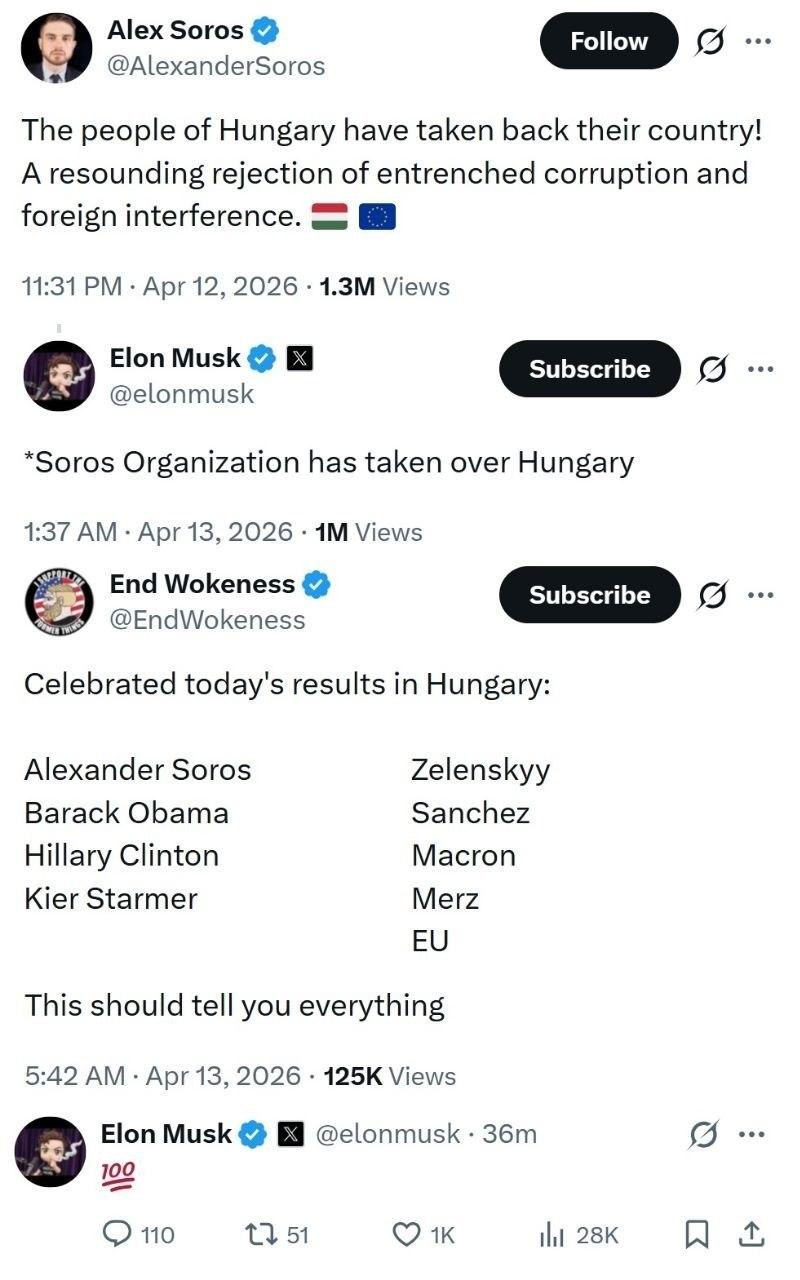 - Кто приветствовал итоги выборов в Венгрии? Александр Сорос, Барак Обама, Хиллари Клинтон, Кир Стармер, Зеленский, Санчес, Макрон, Мерц, ЕС. Это всё что вам нужно знать.