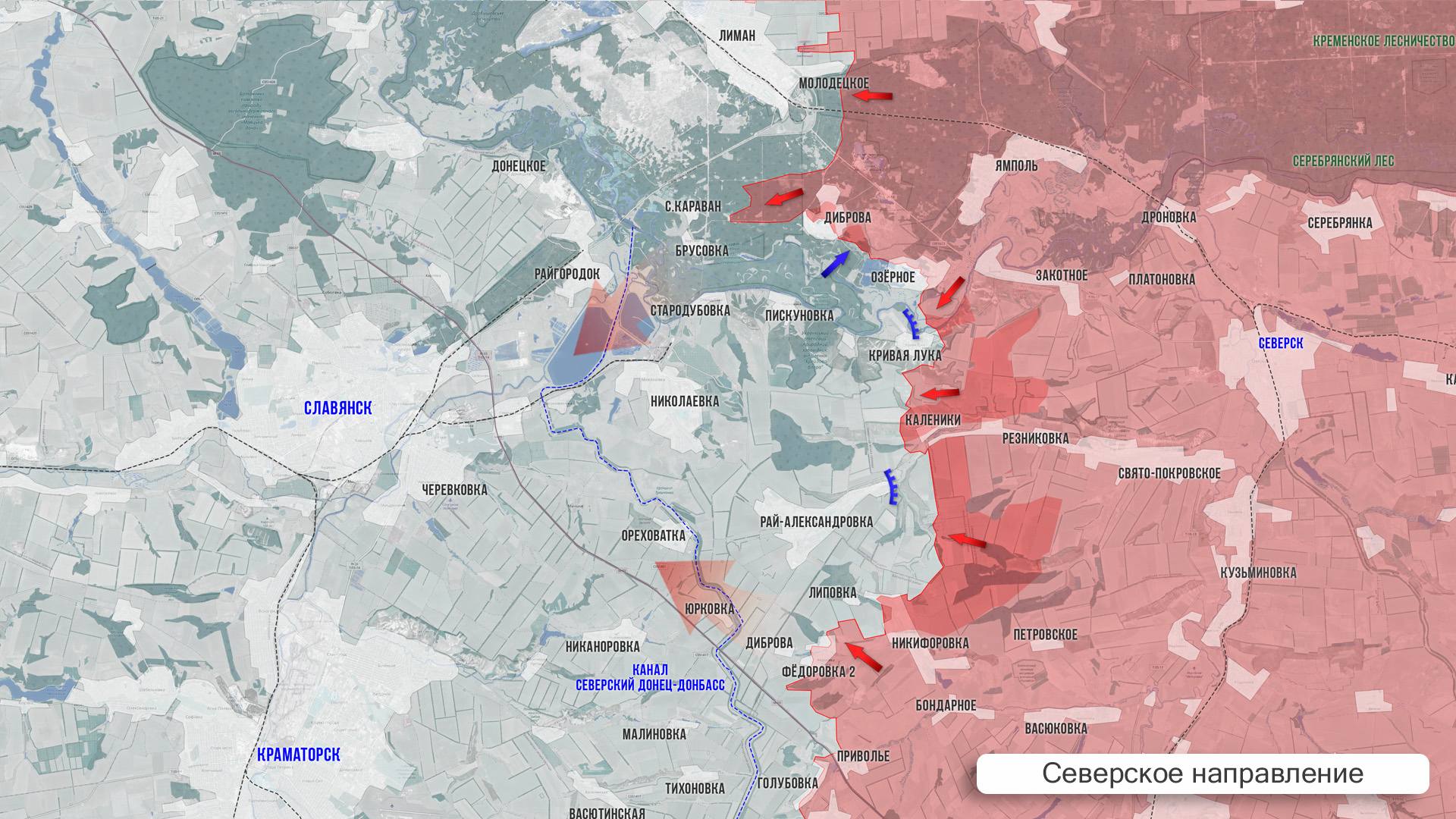 На Северском направлении ВС РФ стараются зачистить территорию в округе Фёдоровки Второй, Дибровы и у Липовки. Есть успехи у наших войск и в районе Калеников. В Кривой Луке по позициям врага плотно работает артиллерия. В районе Старого Каравана наши бойцы зачистили довольно большой карман южнее дороги на Славянск.