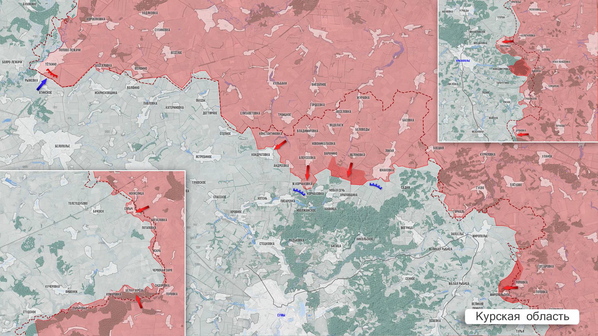 В Сумском приграничье ожесточённые бои идут в районе Кондратовки, а также у сёл Малая Корчаковка и Корчаковка. Появляются сообщения, что наши ДРГ зашли в леса к северу от Хотени. Тяжёлые бои идут к югу от Варачино. Ниже по карте ВС РФ вытесняют противника из Мирополья, где под нашим контролем находится центральная и восточная части села.