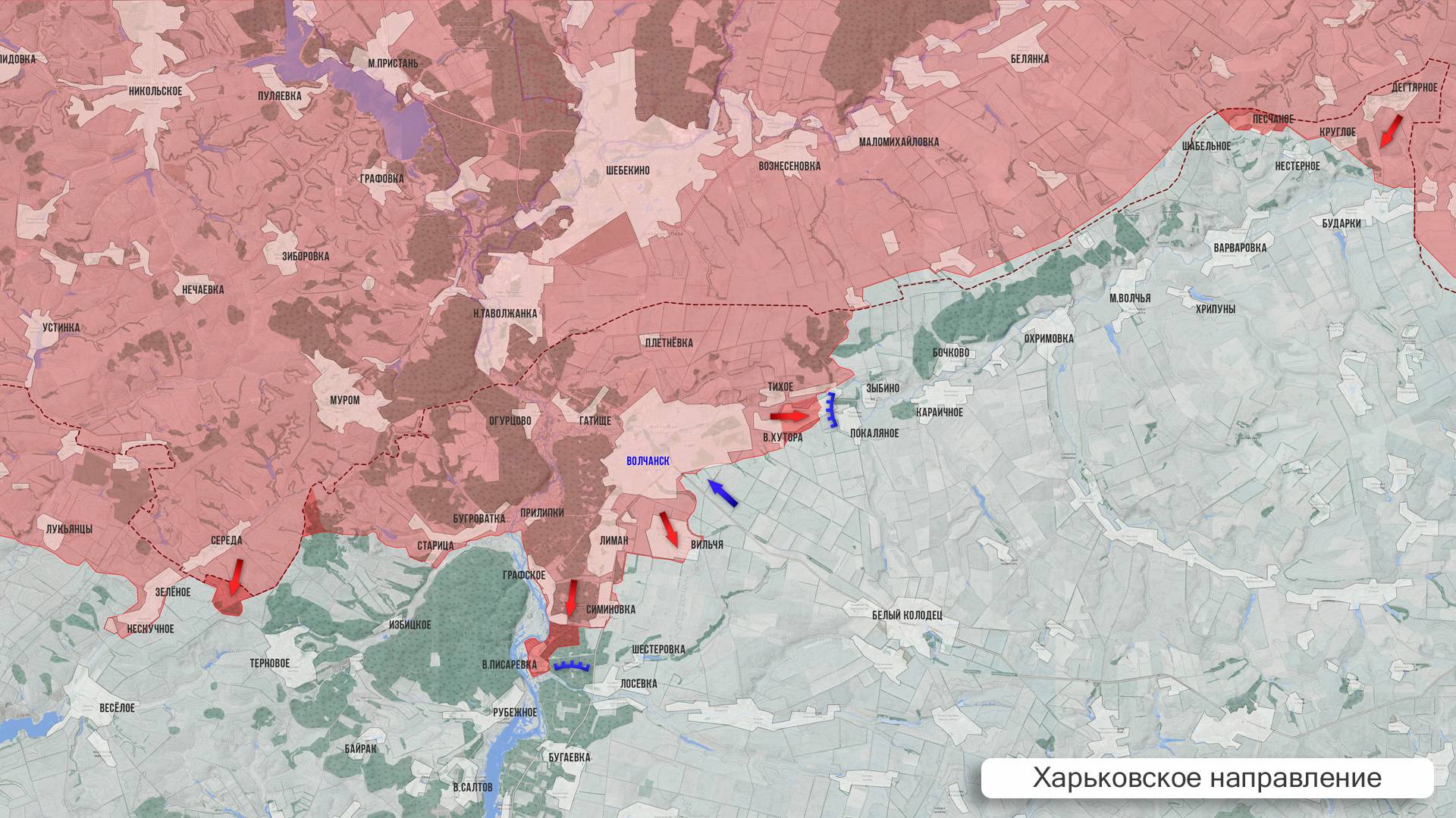На Харьковском участке ВС РФ заняли новые позиции к югу от Старицы. Также бои идут в лесах у Верхней Писаревки. После освобождения Волчанских Хуторов наши бойцы продвинулись вдоль границы напротив сёл Марьино и Красное, обойдя с севера несколько сёл, лежащих вдоль русла р. Волчья.