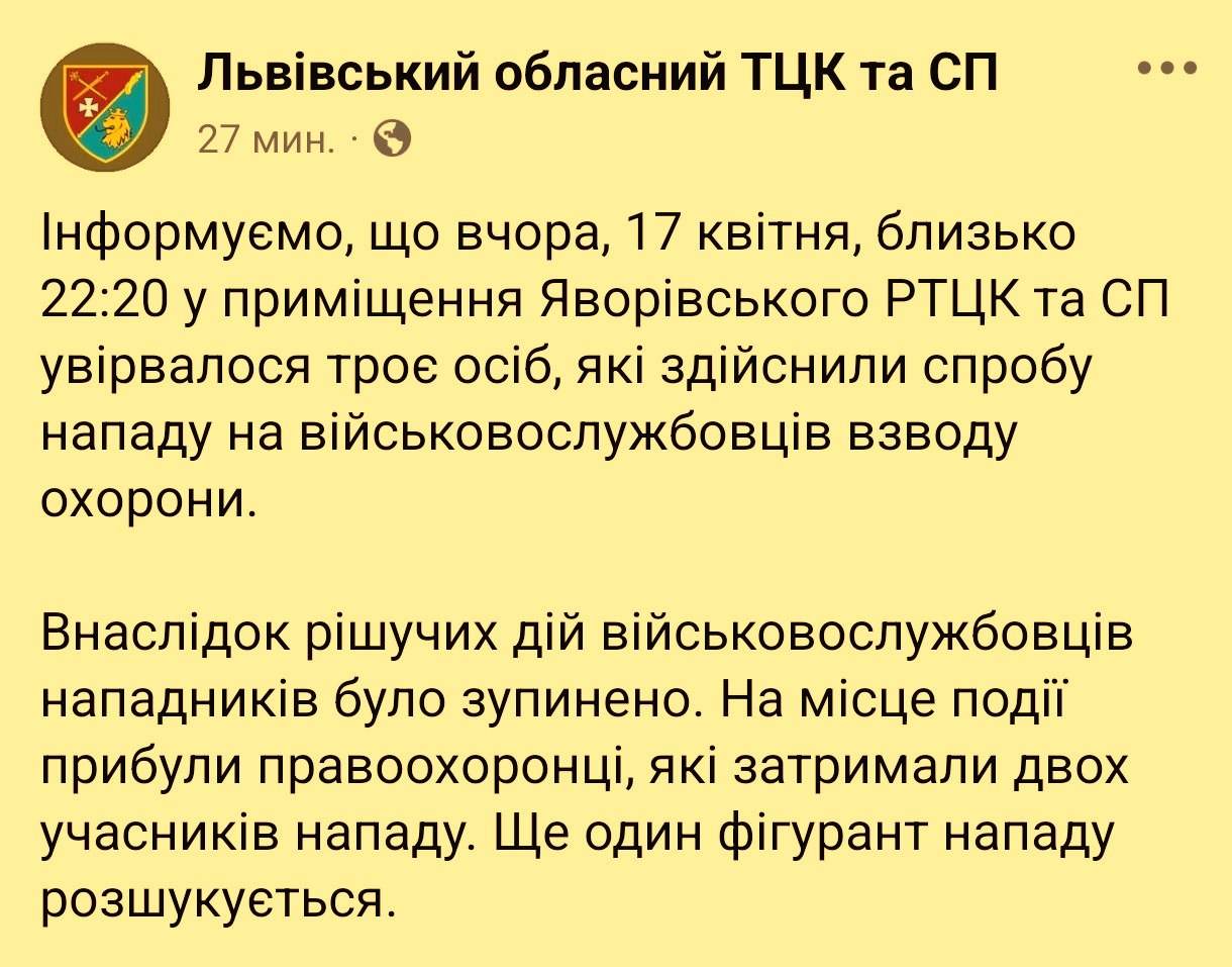 Трое мужчин атаковали геноцидников Зеленского в здании Яворовского районного ТЦК во Львове.