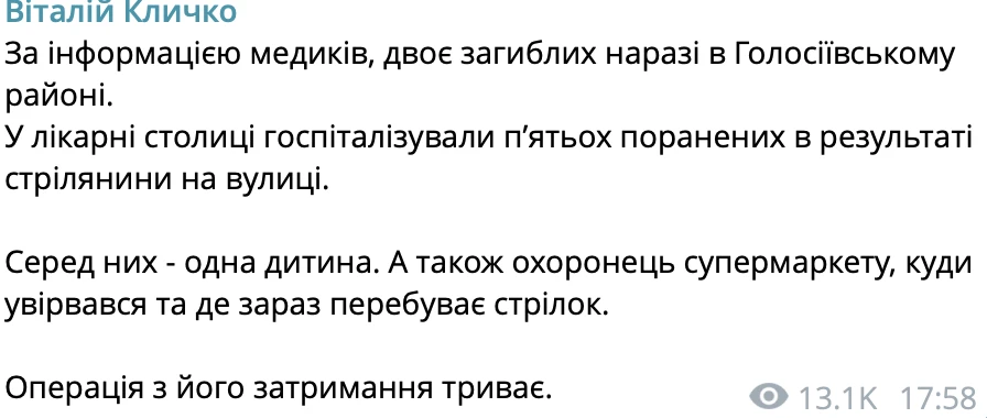 «По информации медиков, двое погибших в настоящее время находятся в Голосеевском районе. В столичные больницы госпитализированы пять пострадавших в результате стрельбы на улице. Среди них — один ребёнок. Также ранен охранник супермаркета, куда ворвался стрелок и где он сейчас находится. Операция по его задержанию продолжается».