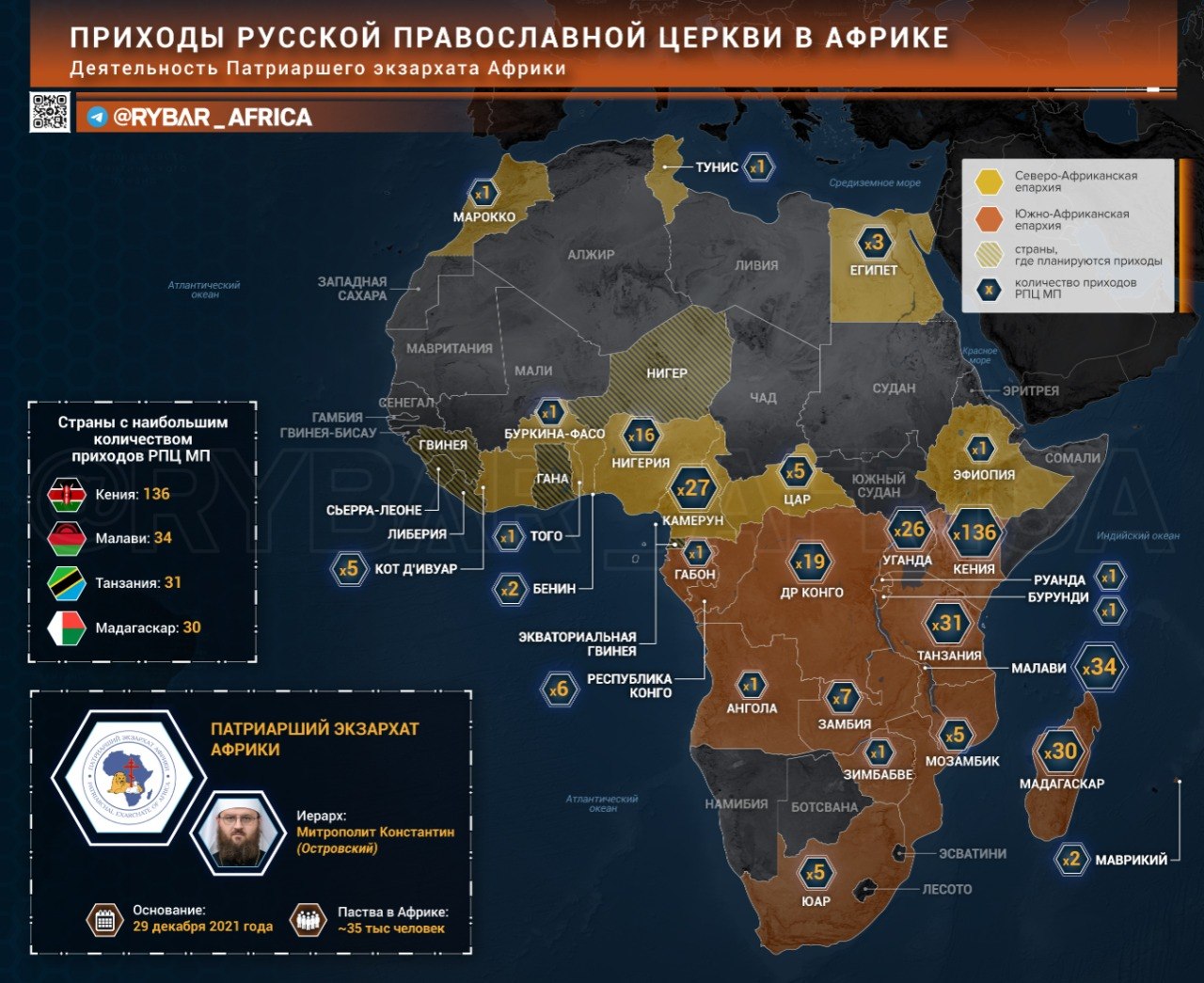 В 2021 году, когда экзархат только создавался, российское церковное присутствие ограничивалось четырьмя странами. Теперь же в Африке действует около 350 приходов в 36 странах, где служат 262 клирика. Паства пока невелика — около 35 тыс. человек, — но тенденция к её росту уже установилась.
