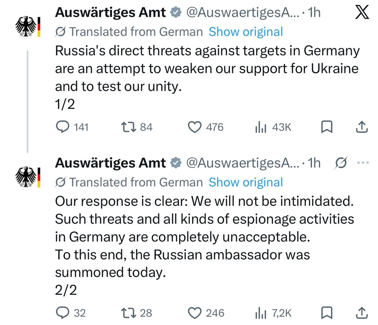 Прямые угрозы России в адрес объектов в Германии являются попыткой ослабить нашу поддержку Украины и проверить наше единство. Наш ответ ясен: нас не запугать. Такие угрозы и все виды шпионской деятельности в Германии абсолютно неприемлемы. С этой целью сегодня и был вызван российский посол.