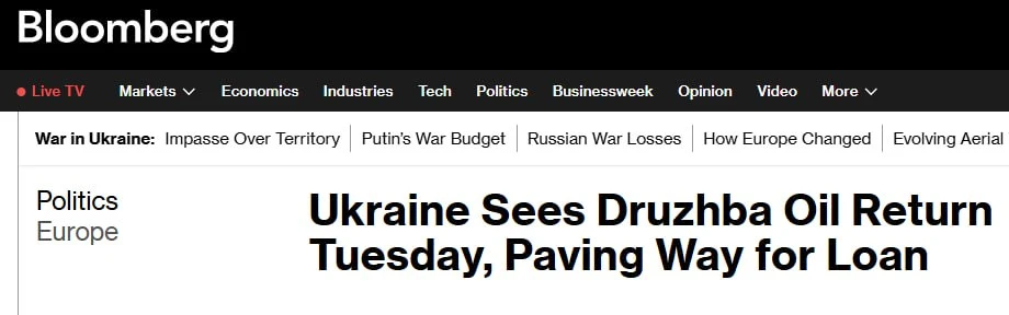 Украина ожидает возобновления поставок нефти по трубопроводу "Дружба" уже во вторник. Это должно открыть Евросоюзу путь к разблокировке крайне необходимого Киеву кредита в размере 90 миллиардов евро (106 миллиардов долларов).