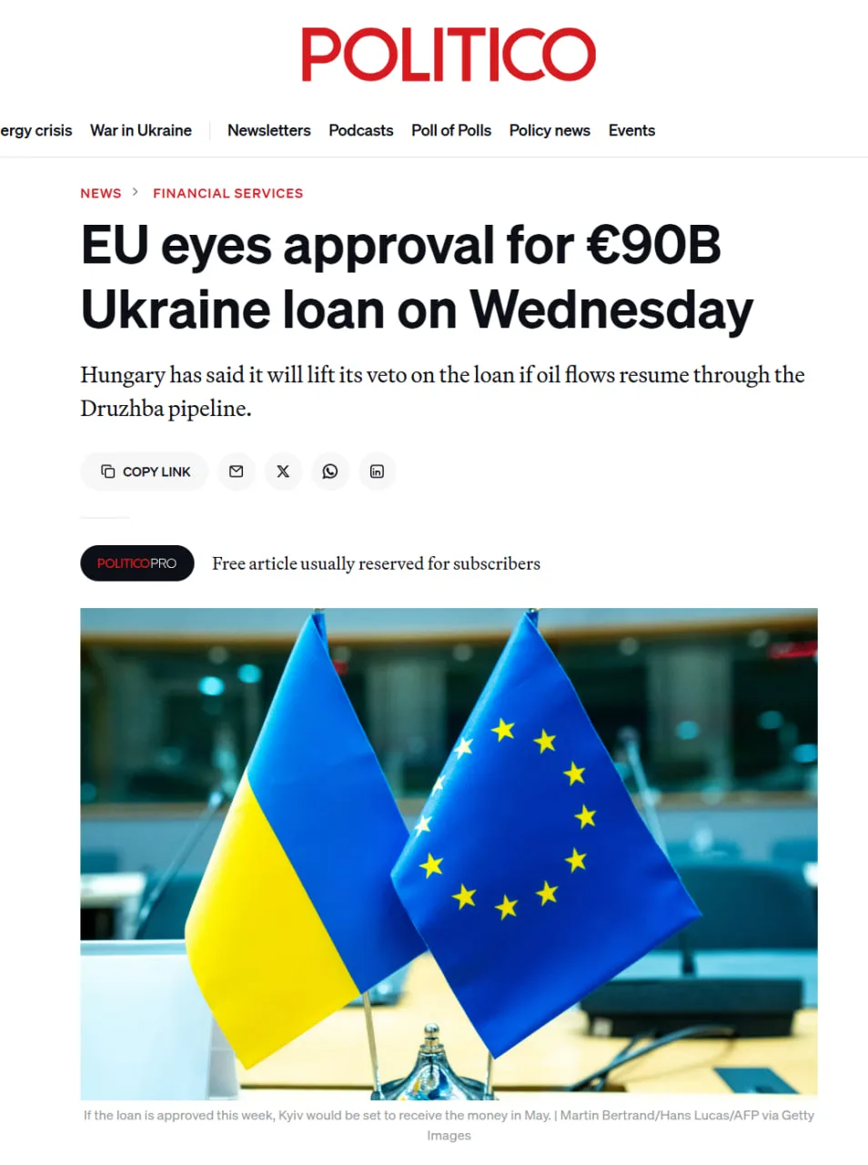 Издание пишет, что послы союза готовы одобрить выделение Украине кредита в размере 90 миллиардов евро в среду, если транзит российской нефти в Венгрию возобновится в срок.