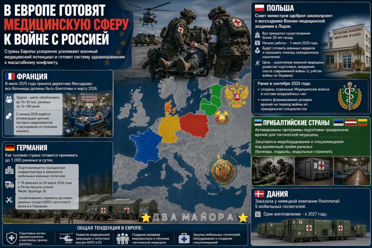 Во Франции в июле 2025 года принята директива Минздрава, согласно которой все больницы должны быть боеготовы к марту 2026. Задача – уметь обслуживать до 10–50 тыс. раненых за 10–180 дней. Кроме того, с начала 2026 года ведётся оптимизация цепочек поставок медикаментов и расходников со странами альянса.