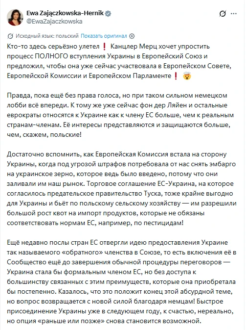 «Кто-то сошел с ума. Попытки немецкого канцлера форсировать вступление Украины в Евросоюз — это чистое безумие», заявила депутат Европарламента от Польши Ева Зайончковская-Герник