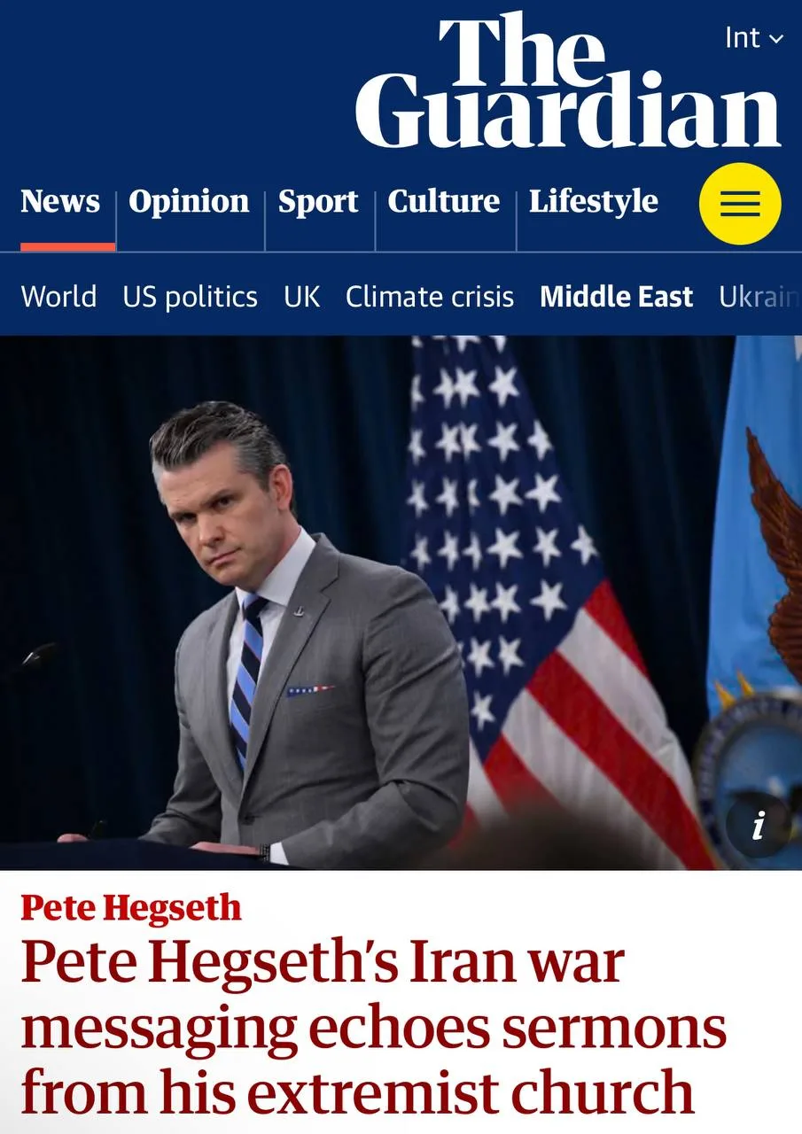 Проповеди Хегсета списаны с церковных речей, пишет британское издание The Guardian. По данным журналистов, министр войны США Пит Хегсет повторяет в своих брифингах лексику и тезисы из проповедей радикальной церкви CREC (Община реформированных евангельских церквей), куда он входит.