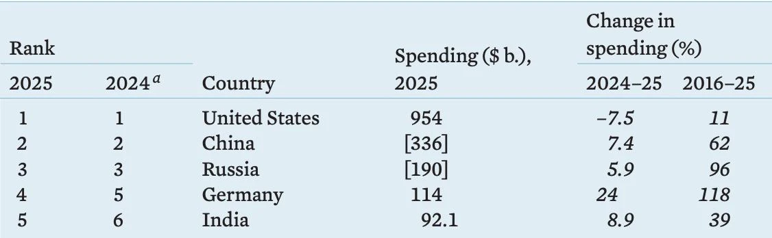 Азия и Океания: Расходы региона выросли на 8,1% (до $681 млрд), что стало самым быстрым ростом с 2009 года. Лидером остается Китай ($336 млрд, +7%).