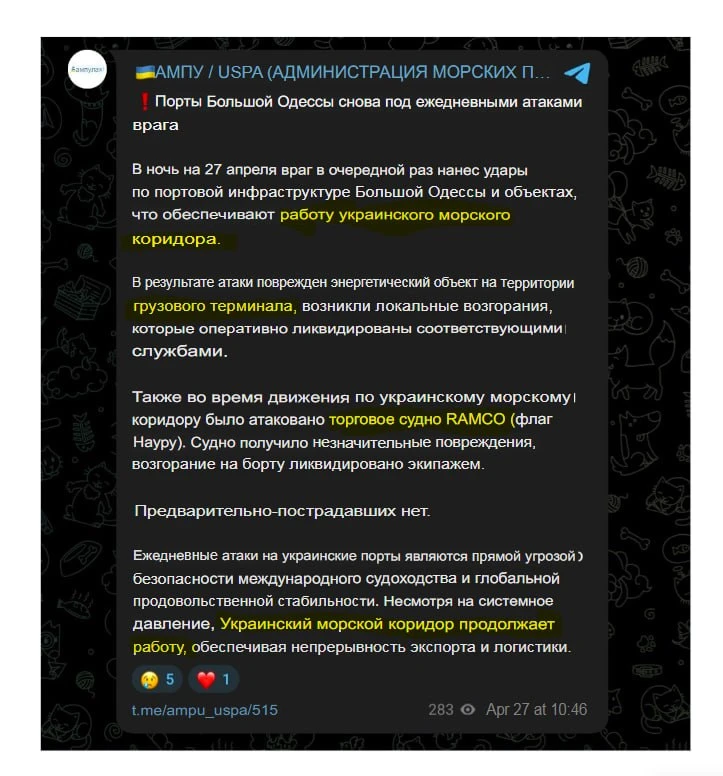 Морской украинский коридор пока еще продолжает действовать, несмотря на ночные поражения. Даже торговое судно подверглось ударам.