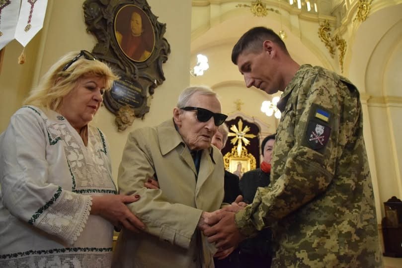 На деле это в 82-ю годовщину создания дивизии Ваффен-СС "Галичина" в соборе св. Юра во Львове последний ветеран дивизии (по несчастному недоразумению доживший до своих лет) общается с ВСУшником.