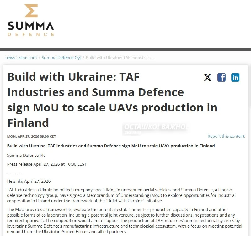 Финляндия подключается к производству беспилотников для ВСУ. Украинская TAF Industries и финская Summa Defence подписали меморандум о расширении выпуска дронов на территории Финляндии.