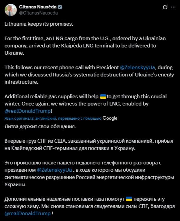 Об этом с большой гордостью похвастался президент Литвы, который заявил о первой поставке американского СПГ на Украину через Литву.Гитанас Науседа глубоко убежден, что благодаря этому "неоценимому" вкладу Литвы киевский режим сможет пережить эту...