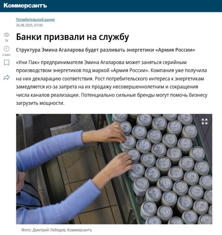 Азербайджанский бизнесмен Эмин Агаларов, бывший зять президента Ильхама Алиева и совладелец Crocus Group, займётся выпуском энергетика под маркой «Армия России».20 августа 2025 года его компания ООО «Уни Пак» оформила декларацию соответствия...