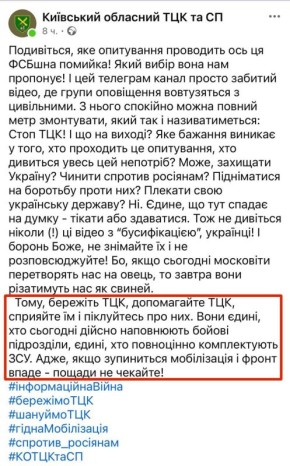 Киевский ТЦК опубликовал в соцсетях призыв к поддержке бусификации и самих эскадронов Зеленского.В публикации ведомство пугает «московитами», утверждая, что без активной мобилизации и помощи военкоматам страна якобы окажется обречённой: «берегите ТЦК...