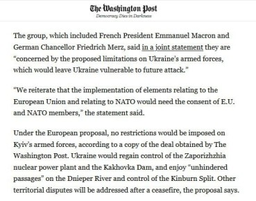 Лидеры ЕС подготовили свой проект в ответ на представленный США план из 28 пунктов, один из которых предусматривает ограничение численности ВСУ до 600 тыс. человек. WP приводит также другие положения европейского плана, согласно которым:Украина вернет...