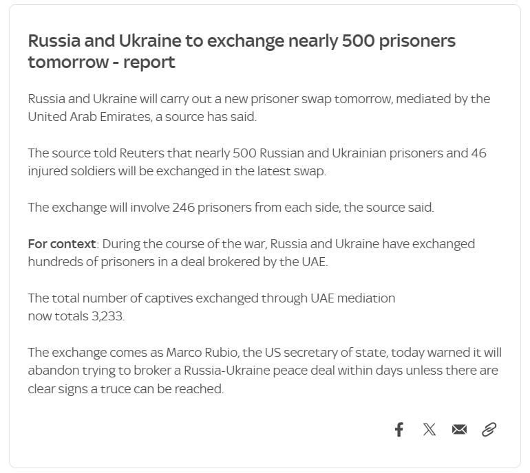 Обмен должен произойти при посредничестве Объединенных Арабских Эмиратов, сообщает Sky News со ссылкой на источник.