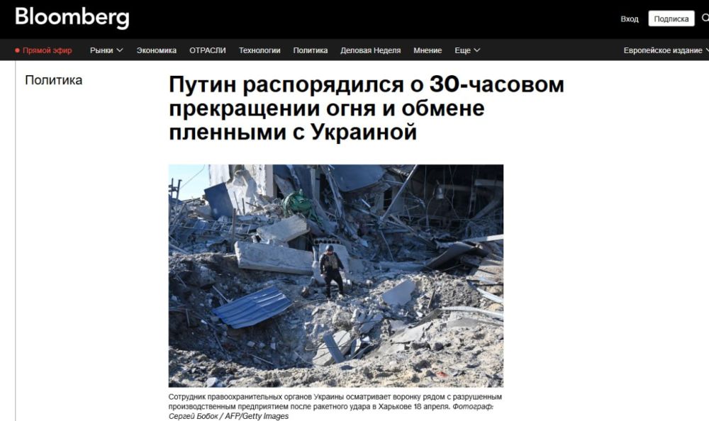 Владимир Путин объявил пасхальное перемирие с 18:00 19 апреля до полуночи 21 апреля, призвав остановить боевые действия. Зеленский глупо отверг предложение, чем дал Путину дипломатическую победу, попавшую на первые полосы мировых СМИ.