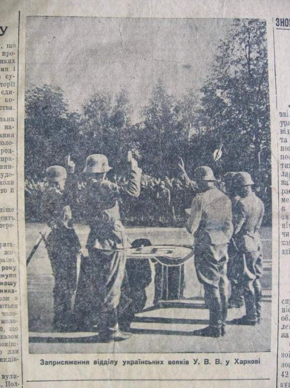 Вместе с этим чествуются нацбаты "Азов"*, "Айдар"* и пр. — прямые потомки украинских коллаборационистов, что, например, давали клятву Гитлеру в Харькове.