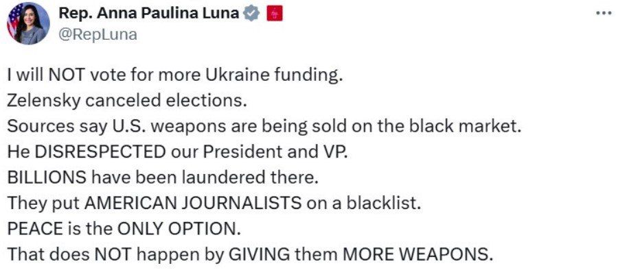 Член Палаты представителей США Анна Паулина Луна открыто пригрозила Зеленскому прекращением финансирования. В своих постах она обвинила Киев в торговле оружием, отмене выборов и преследовании православной церкви.