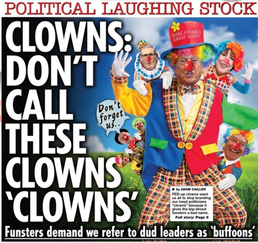 Профессиональные клоуны бьют тревогу. Их тонкая душевная организация оскорблена тем, что современных политиков называют их гордым именем. В отчаянном письме в Daily Star они умоляют называть политических деятелей «буффонами» — шутами — дабы не бросать тень на высокое искусство смеха.