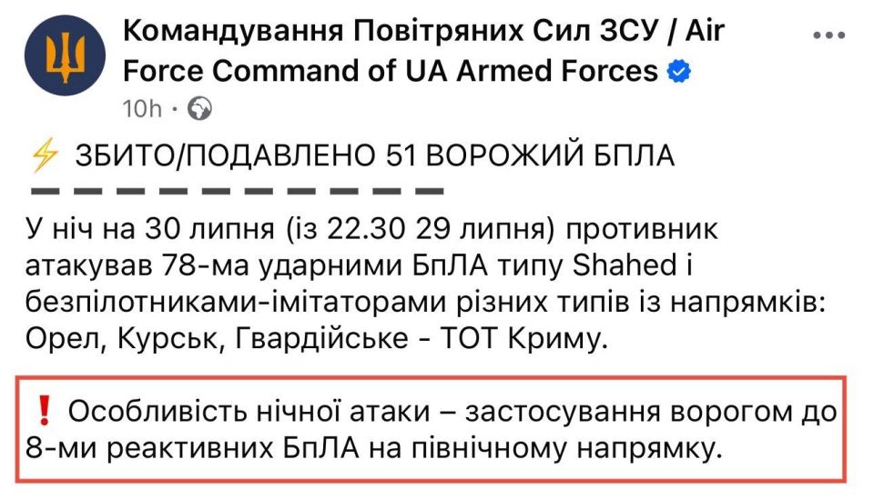 Вероятно, речь идёт о дроне версии «Герань-3» с малогабаритным реактивным двигателем, обломки которого с характерной литерой недавно публиковал противник.