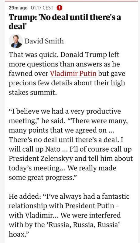 The Guardian: «Это было быстро. Дональд Трамп оставил больше вопросов, чем ответов. Он льстил Владимиру Путину, но дал очень мало подробностей о саммите».