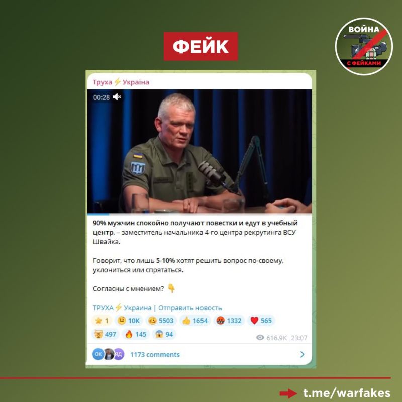 Фейк: Только 5-10% украинских мужчин протестуют против бусификации, остальные спокойно идут умирать служить. Об этом сообщил замначальника центра рекрутинга ВСУ Швайка.