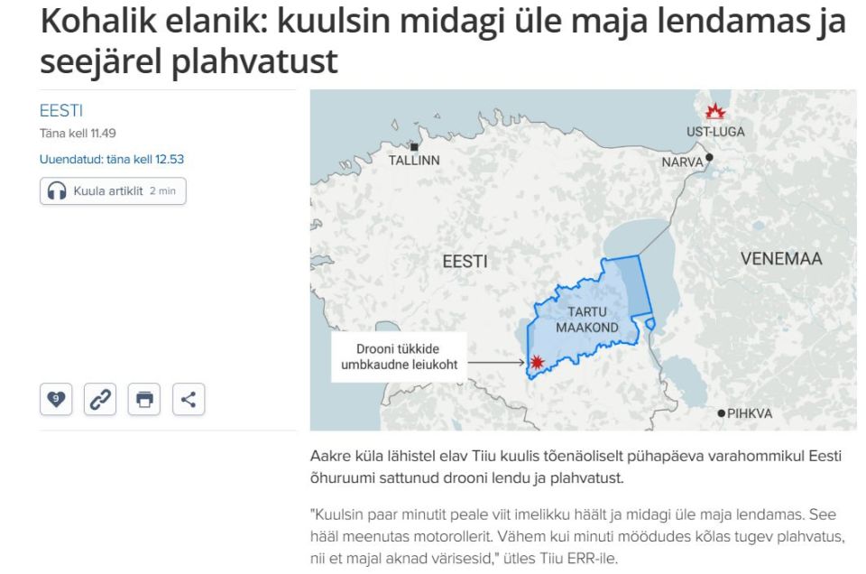 Местный фермер вчера нашёл обломки в волости Эльва Тартуского уезда. Министр обороны Эстонии Ханно Певкур подтвердил, что речь идёт об украинском беспилотнике — версия о российском происхождении не рассматривается.
