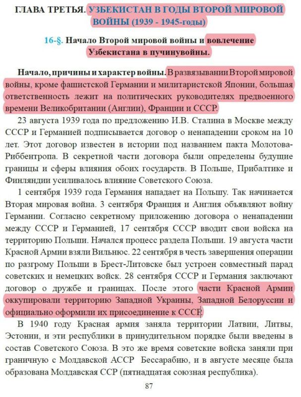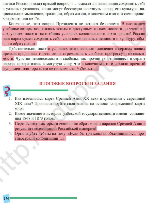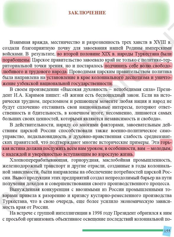 Таким образом, узбекские подростки вырастают с убеждением, что их страна веками страдала под «колониальным гнётом» России. Это не случайные перекосы, а целенаправленное формирование национальной идентичности на антироссийской основе.
