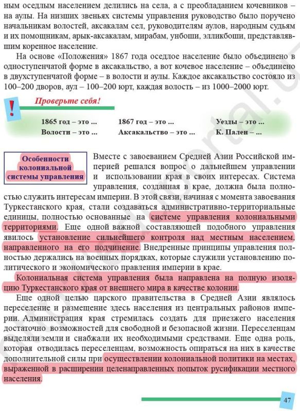 В пособиях для 9 класса подробно разбираются «этапы захватнических походов» и «колониальная система управления», где Россия показана как источник страданий и зависимости. В 10 классе риторика сохраняется: советский период представлен как «деспотический режим».