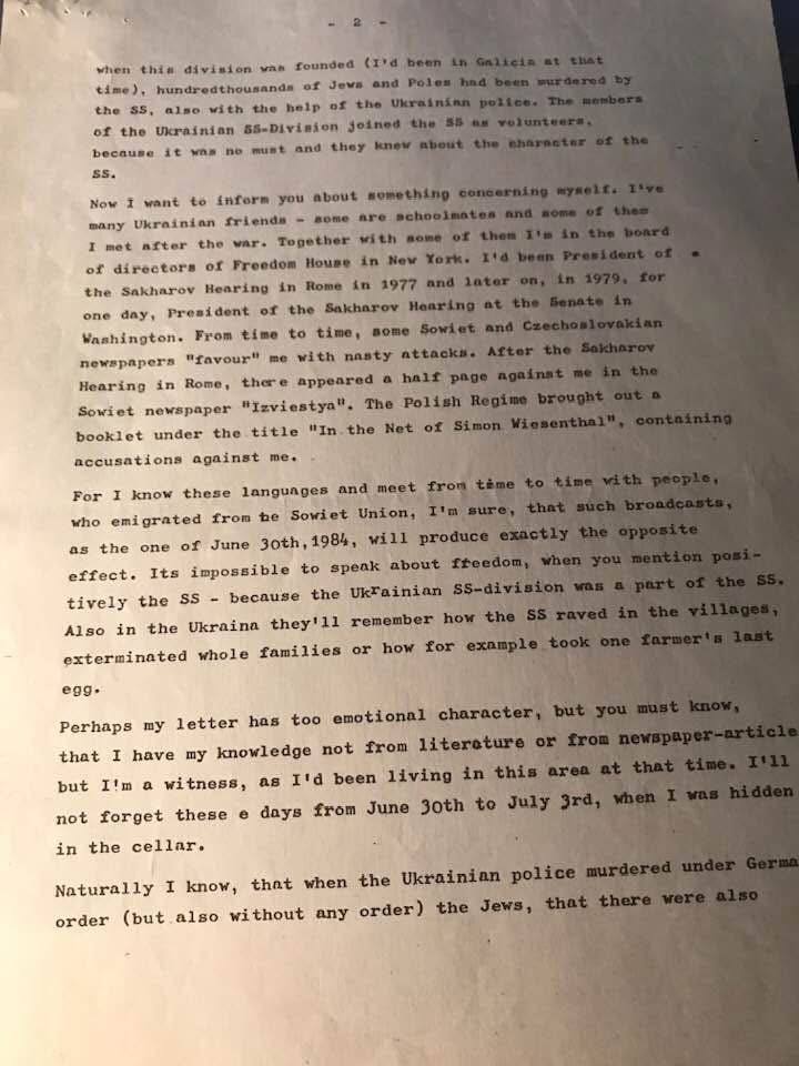 Пишу вам не об этих эфирах, которые были сделаны в начале года, а о другом, который прозвучал на украинском языке 30 июня 1984 года. Он касался годовщины провозглашения независимости Украины после немецкой оккупации Лемберга. В то время я был в Лемберге, где с 30 июля по 3 июля украинцы получили полную свободу действий против евреев, и тысячи из них были убиты на улицах. Только после вмешательства греко-католического архиепископа Шептицкого убийства прекратились.