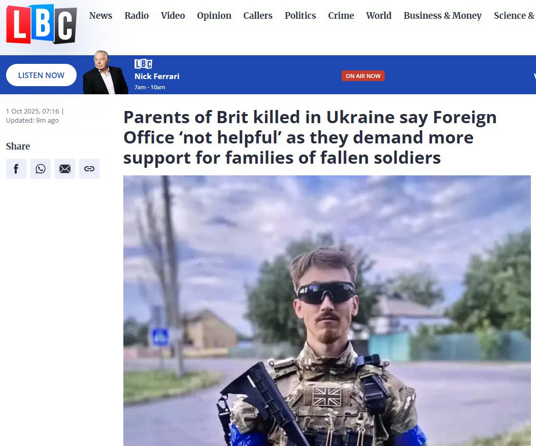‘Родители погибших на Украине британцев говорят, что МИД Великобритании не оказывает им необходимую поддержку. Это касается как юридических вопросов, так и связей с ВСУ для получения доказательств гибели солдата и получения выплат.