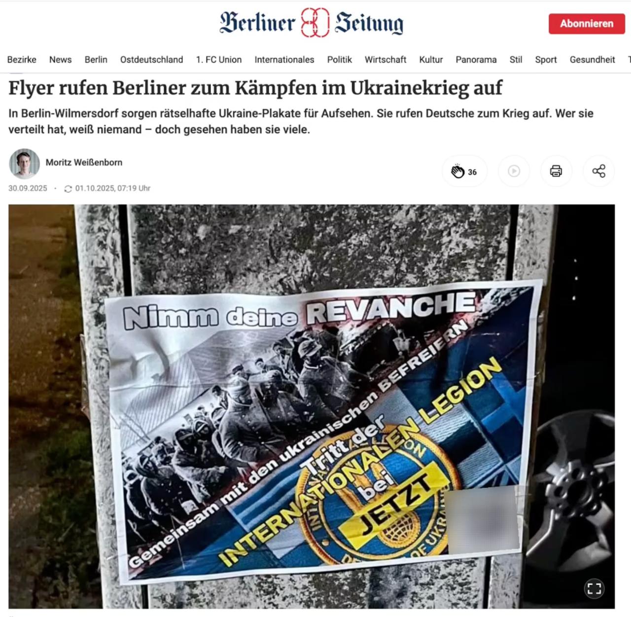 Berliner Zeitung сообщает, что в Берлине появились листовки с реваншистскими лозунгами и предложением записаться в ВСУ.