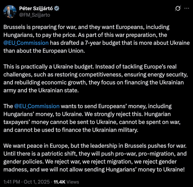Министр иностранных дел Венгрии Петер Сийярто раскритиковал новый семилетний бюджетный план Евросоюза, заявив, что он ориентирован на финансирование Украины в ущерб интересам европейцев.