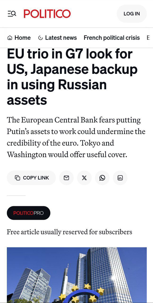 «Большая тройка» ЕС в составе G7 — Германия, Франция и Италия — призывает Японию и США консолидированно украсть российские активы, чтобы продолжать милитаризацию Украины, сообщает Politico.