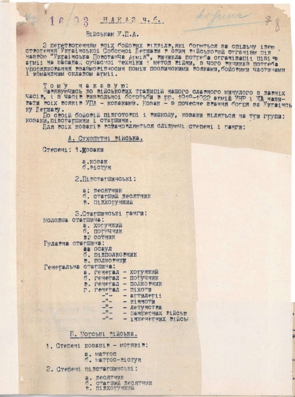 27 августа 1943 года для бандеровцев издаётся и подписывается моральным уродом Дмитром Клячковским ("Кимом Савуром") приказ, согласно которому "всех воинов-повстанцев" следует именовать кОзаками.